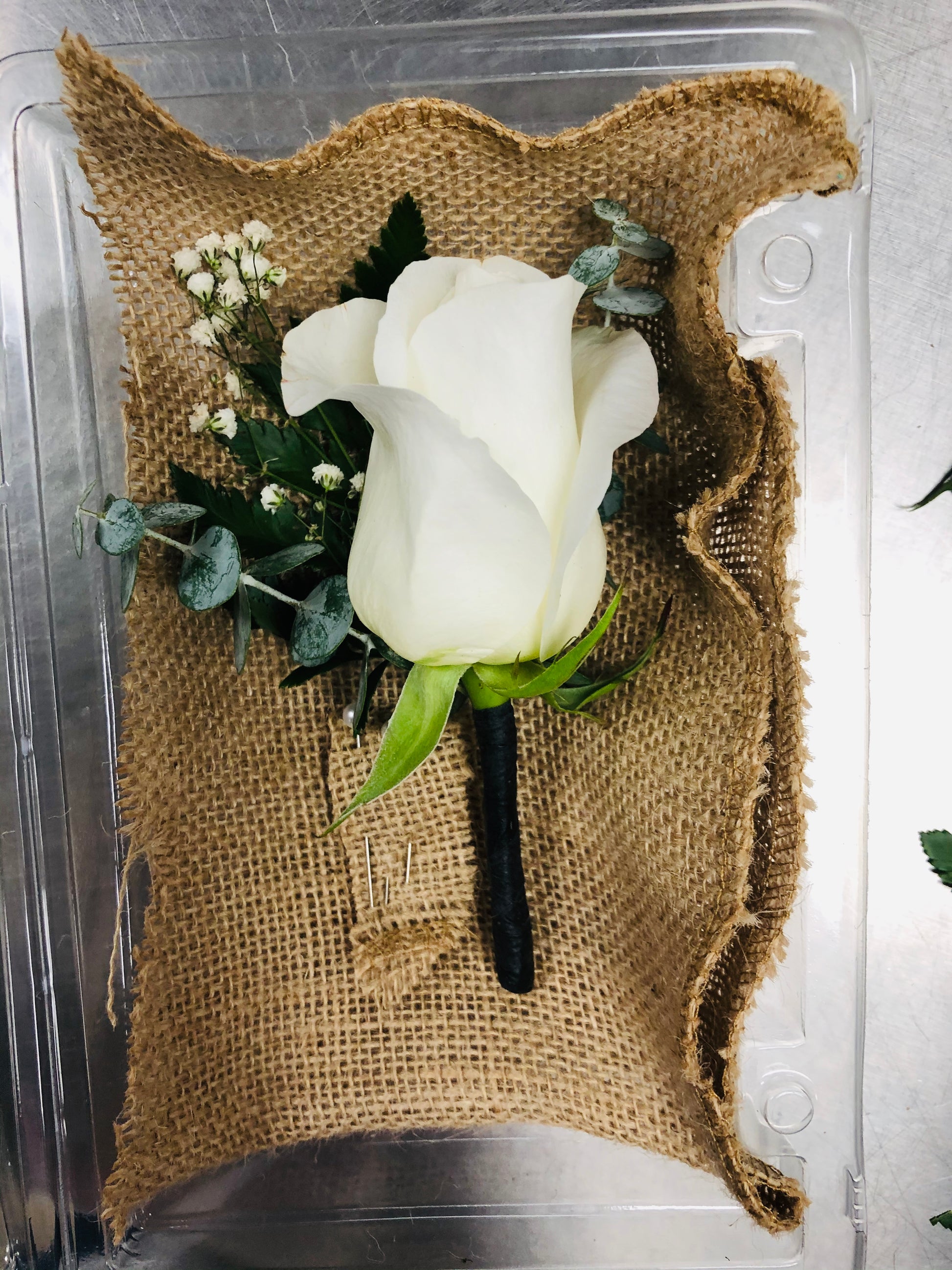 A single rose boutonniere with greenery and filler flowers to accentuate.