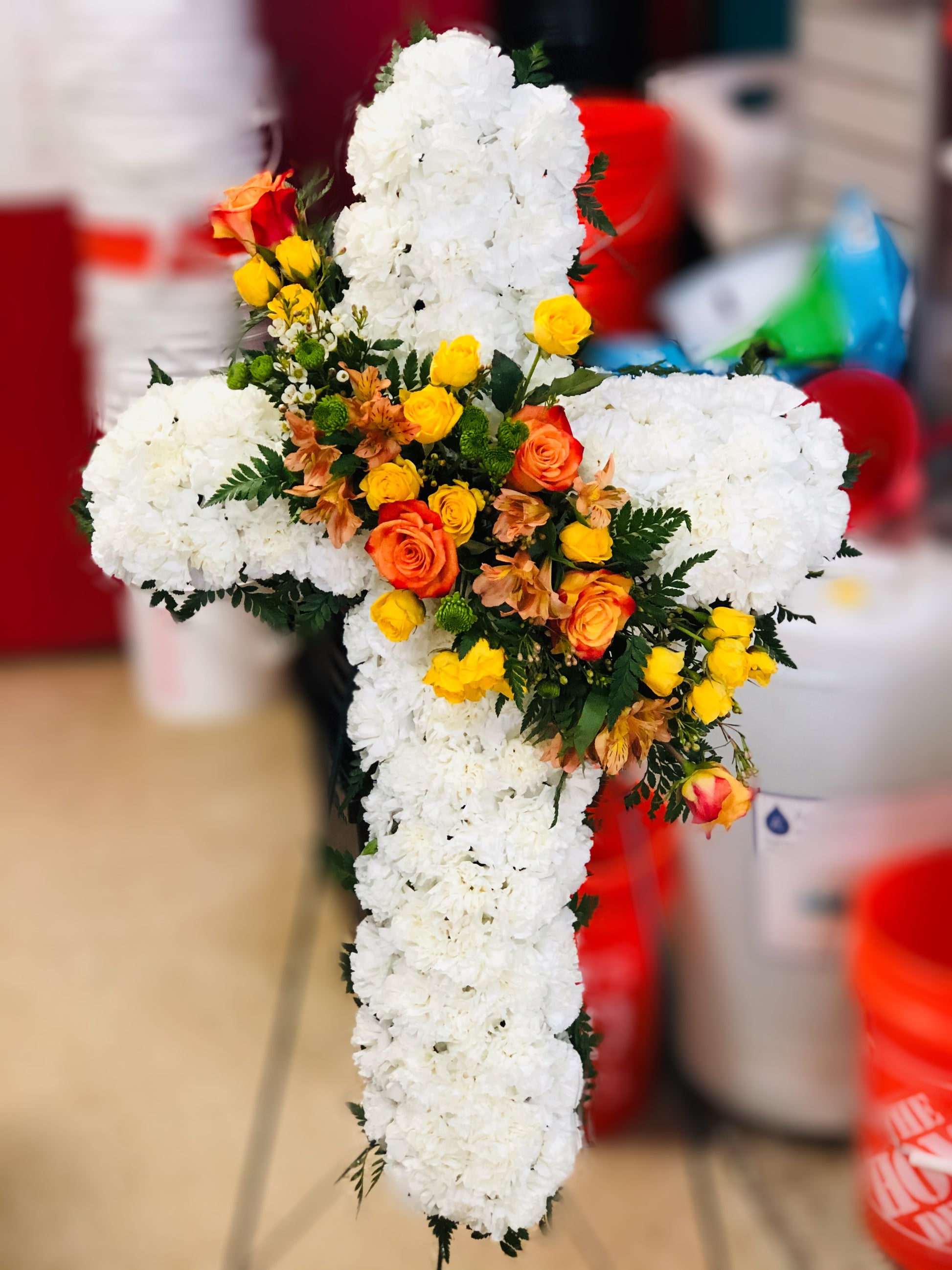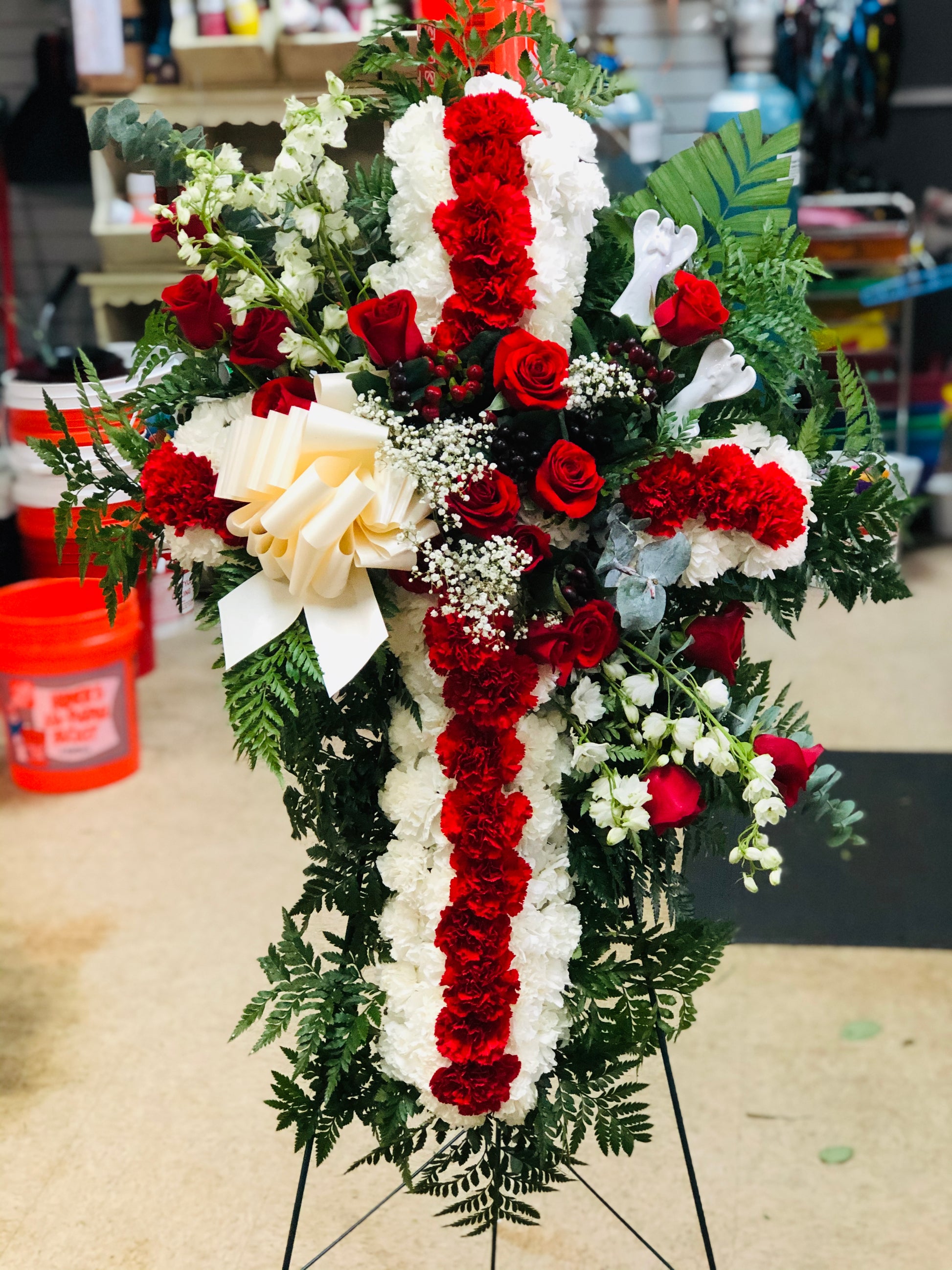 A standing funeral piece in the shape of a cross, to commemorate the life of a loved one.